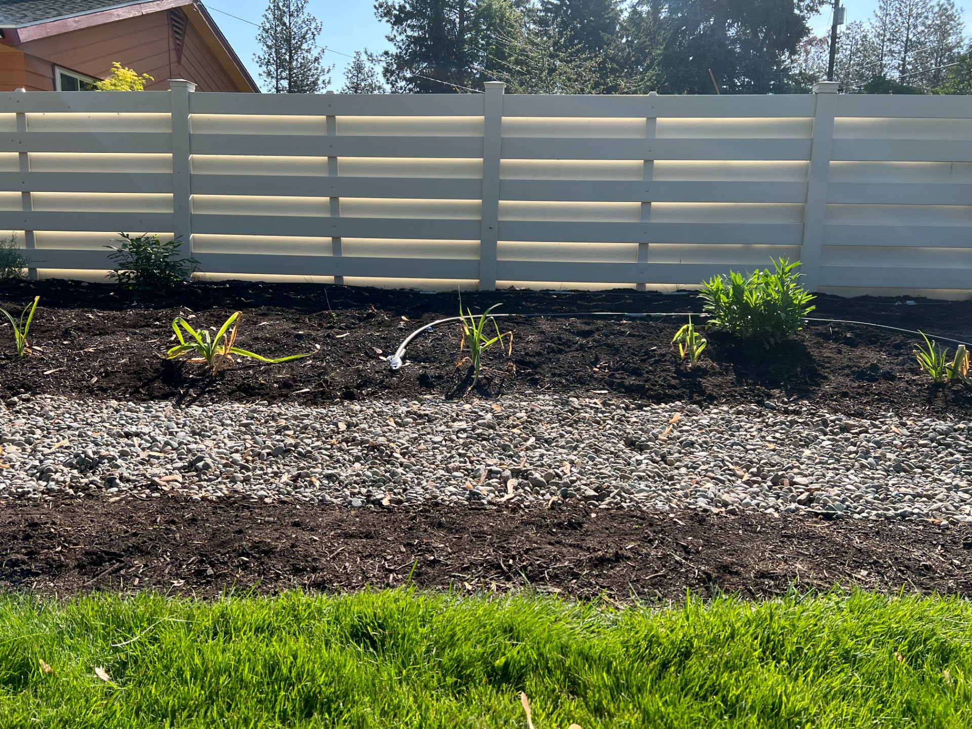 Using Spokane Scape techniques of weed control, Hugelkultur raised bed building and a cohesive design, this garden requires only monthly maintenance now. Much of the products used on this project were repurposed from clients own yard. Including river rock and retaining wall for corner raised bed.